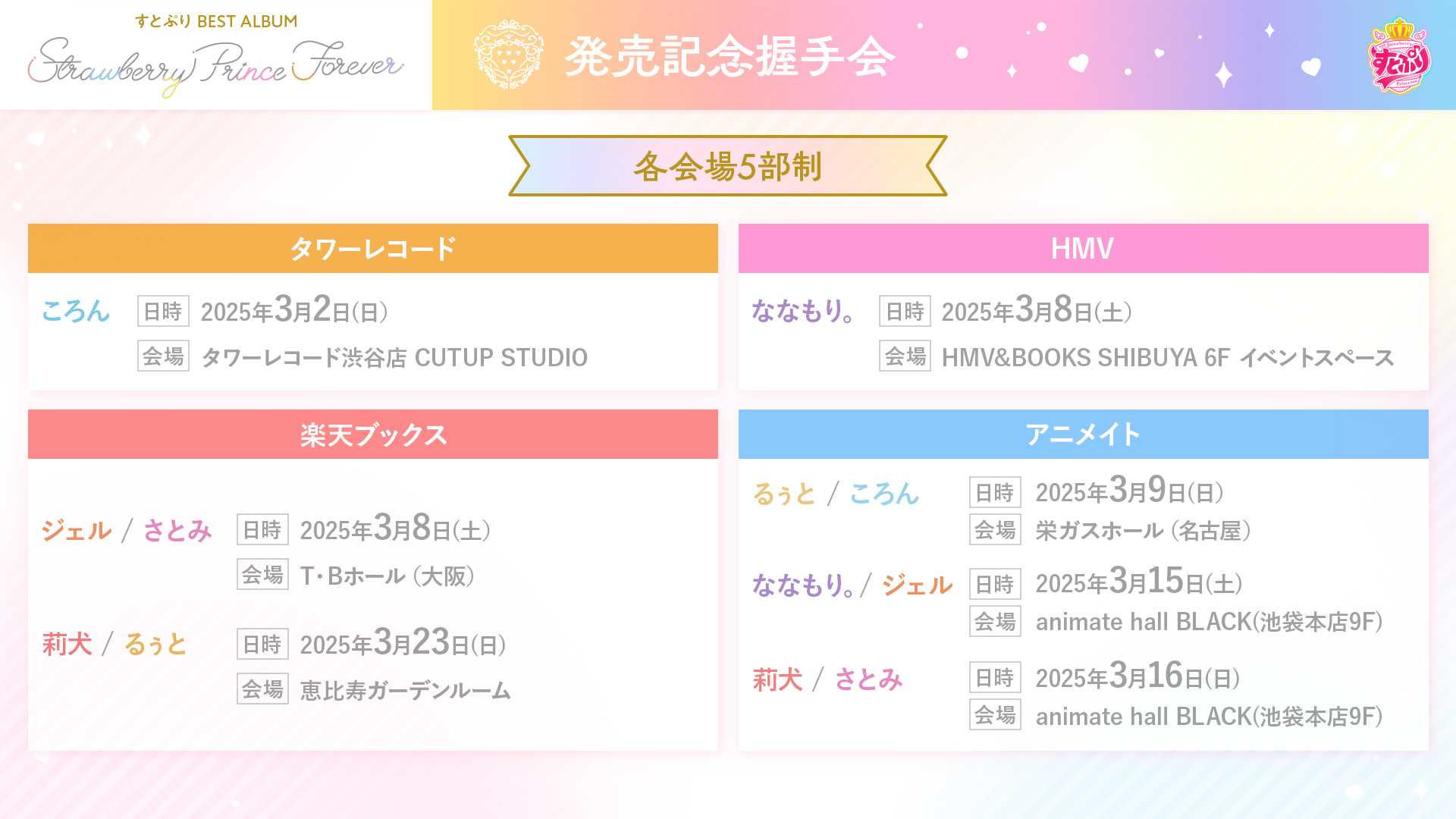 株式会社STPR(本社:東京都渋谷区 代表:柏原 真人、以下STPR)は、所属の2.5次元アイドルグループ「すとぷり」初のベストアルバムである、「すとぷり BEST ALBUM 『Strawberry Prince Forever』」を2025年1月8日(水)に発売することを発表し、2024年10月26日(土)に予約受付を開始した。