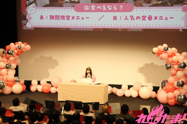 続いては、オーディエンス参加型の「さくねこアンケート」コーナー。次々に出される究極の(?)2択問題に、客席が手元に配られた「紅白の紙」を掲げて回答。坂倉さんが事前に結果を予想する……というルール。