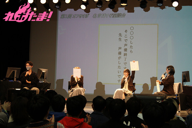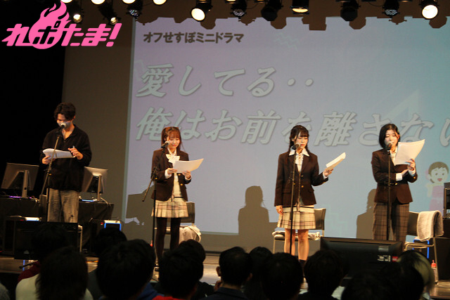 続いて「オフせすぽミニドラマ」。TinkerBellさんが「新人声優」役、立石さんが「人気男性声優」役、水野さんが「大御所男性声優」役、そして村上さんが「音響監督」役として、リアルな(?)アフレコ現場を舞台にした物語の朗読を行なった。