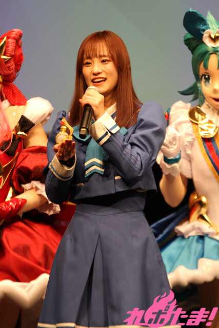 最後はタカラトミーの五十嵐氏が登壇し、関連グッズの紹介。3人は子供向けコスチュームを前に「私たちが着ると破れちゃいそうだね……」と苦笑いしつつ(笑)、童心に帰ったようにはしゃぎながらグッズに触れていた。