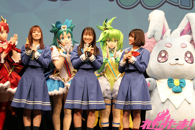 当日はメインキャストの3人(空野みなも/プリンセス・リップル役・葵 あずさ、識辺かがり/プリンセス・ジール役・藤本侑里、一条ながせ/プリンセス・ミーティア役・橘 杏咲)のほか、諏訪 豊プロデューサー(キングレコード)、菊田大介氏(Elements Garden)、五⼗嵐ゆい⼦氏(タカラトミー 玩具開発担当)が登壇。本作についての最新情報を交えたトークが行われた。