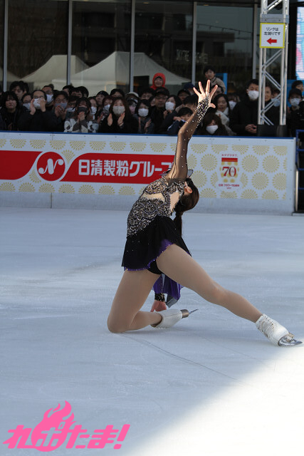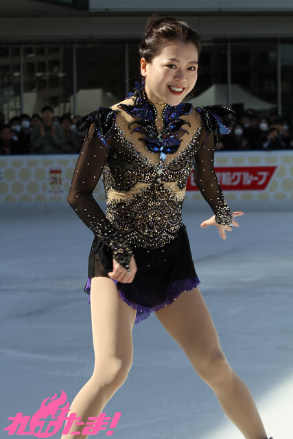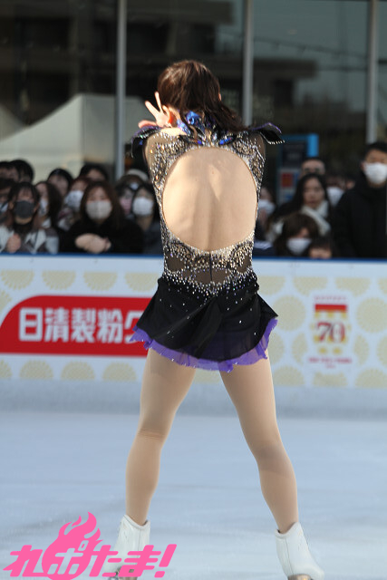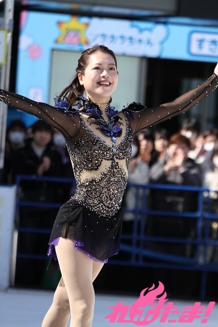 この日の衣装は彼女が自前で用意したもの。「作中で狼嵜 光(かみさき ひかる)も試合で使用した交響詩『死の舞踏』の演技で着用したことがある」とのこと。米津玄師が歌うオープニング主題歌「BOW AND ARROW」(テレビサイズ)に乗せ、約1分半の演技を披露し、スケートリンクをぐるりと囲んだオーディエンスを魅了した。