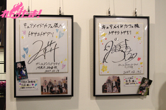 ▲公式YouTubeチャンネルの生配信で「CURE MAID CAFÉ(キュアメイドカフェ)」を訪れたルパ役・朱李さん、桃香役・夕莉さんのサイン色紙も展示!