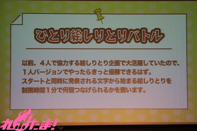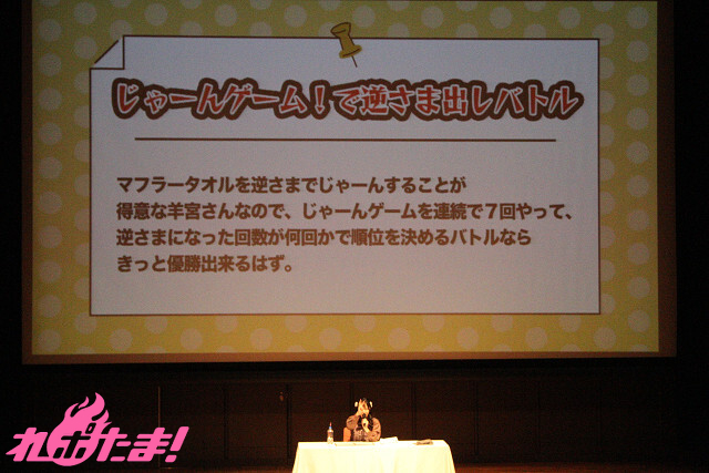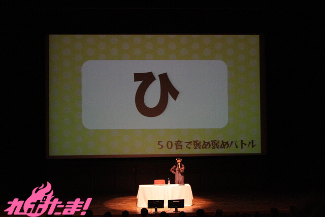 1人で「絵しりとり」をし、制限時間内にいくつ繋げられるかを競う「ひとり絵しりとりバトル」、スクリーンに映し出された文字を頭文字にし、誉め言葉を考えていく「50音で褒め褒めバトル」、そして番組リスナーにはおなじみ、イベントグッズのマフラーを紹介する際、逆さに持ってしまいがちな羊宮