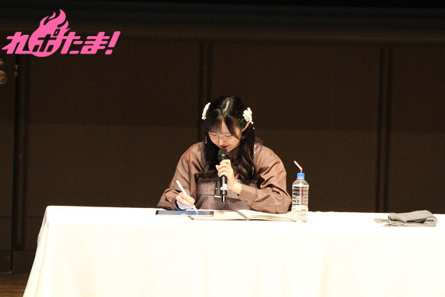 「私のことを応援したくなったきっかけは?」という質問に対する、1人のファンからの「『その着せ替え人形は恋をする』の乾 心寿、『くノ一ツバキの胸の内』のモクレンです」という回答に感激する羊宮さん。