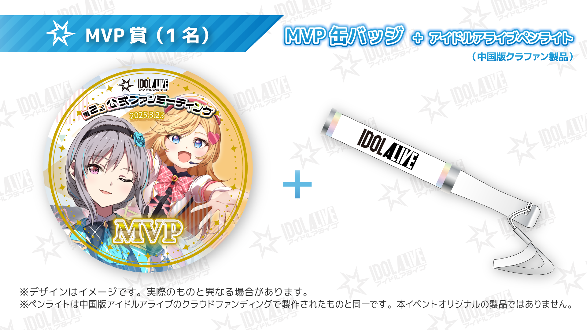 ・景品:MVP缶バッジ+アイドルアライブペンライト(中国版クラファン製品)