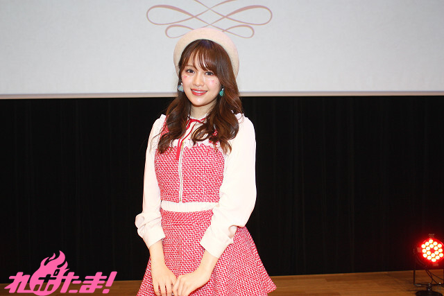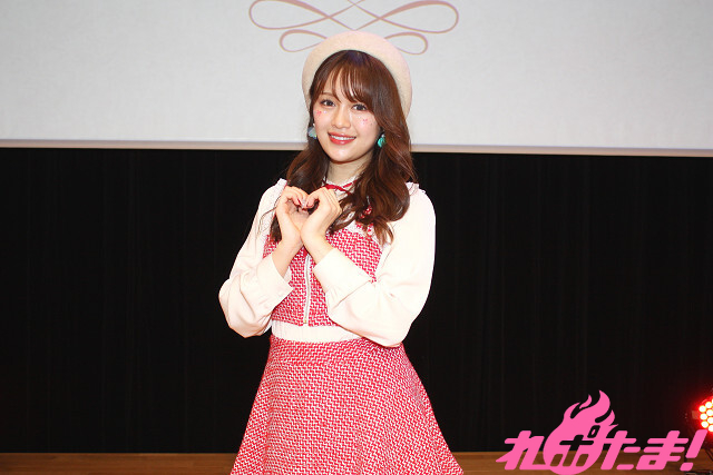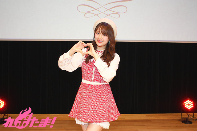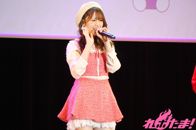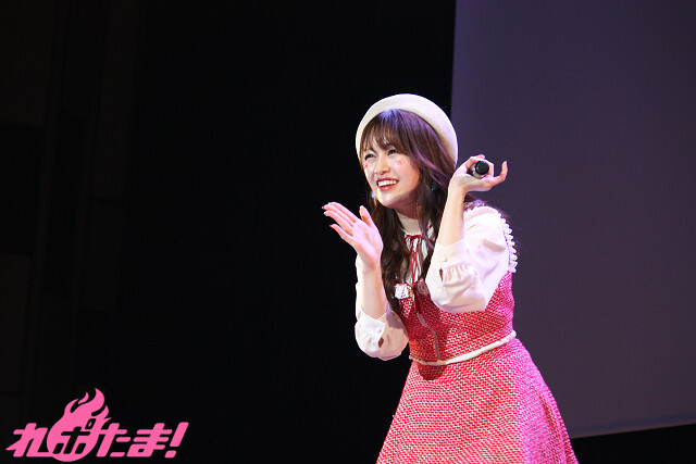 「昼公演」の絵森さんは、テーマカラーとなる赤色のラメ入りツイードのキュートな衣装で登場。白のベレー帽に蝶パレットとストーンを頬に散りばめたメイクもポイントだそうで、ステージ上でクルッと回って衣装をお披露目。会場は「可愛い!」の大歓声に包まれた。