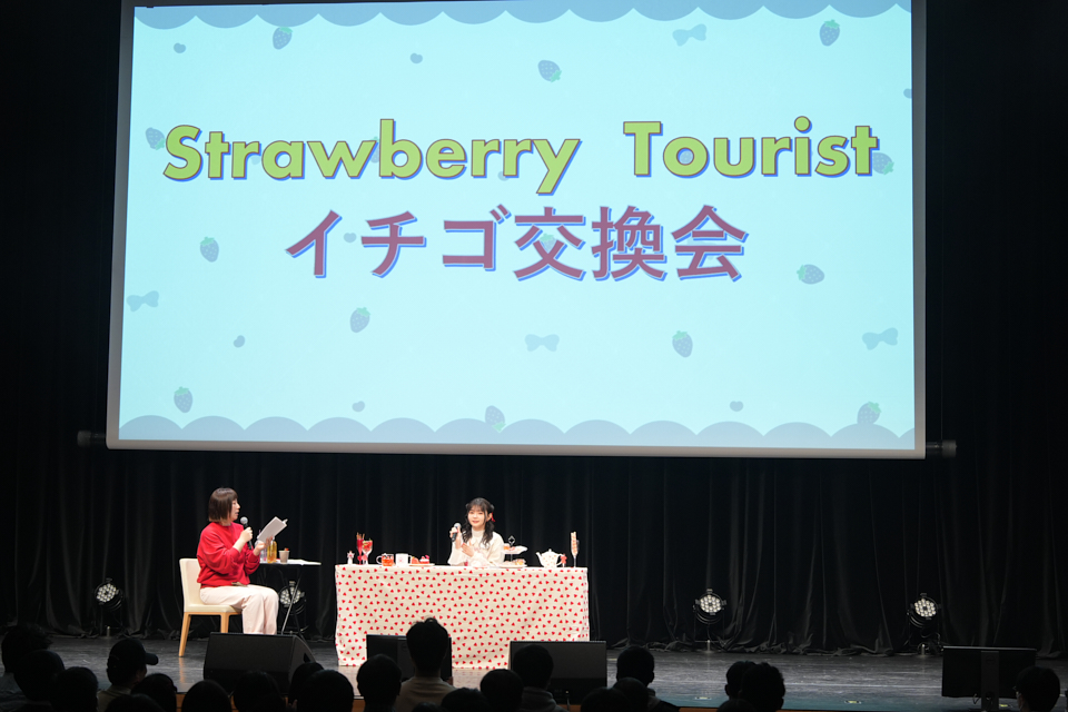 つーりすと(=ファン)のすわわコールでステージに登場した諏訪ななか。グッズのTシャツにいちごがプリントされたスカートを合わせた春らしいコーディネートで登場し、工藤プロデューサーとのトークパートがスタート。まずは「Strawberry Tourist!イチゴ交換会