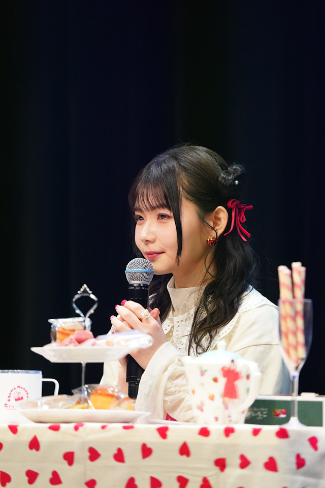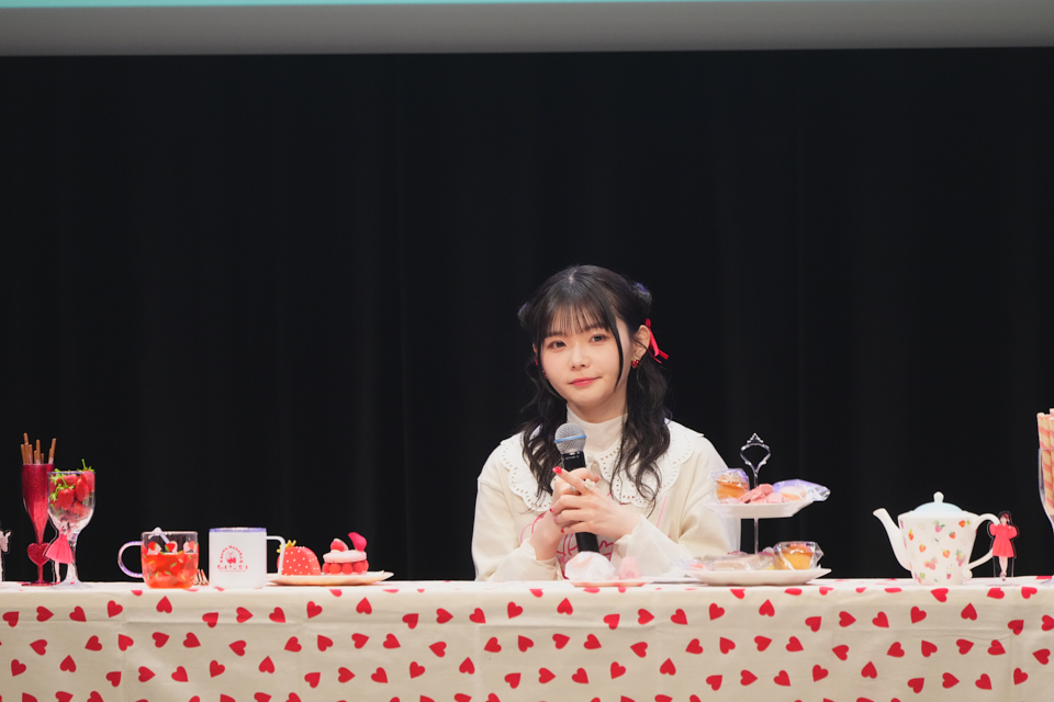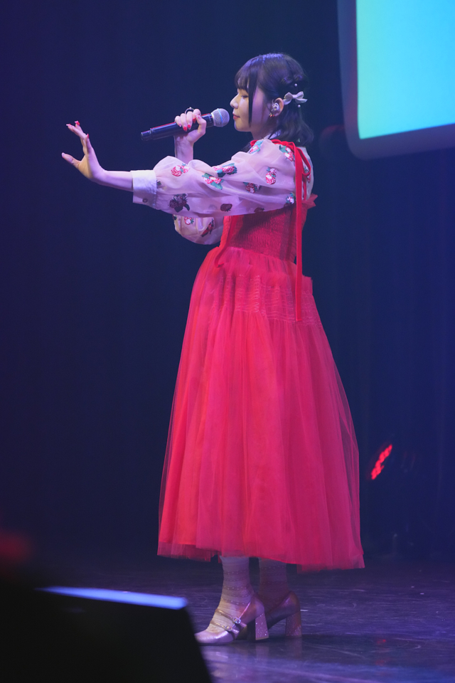 楽しいトークパートを終えると、ミニライブがスタート。いちごが刺繍されたシャツと肩紐にリボンの付いた真っ赤なワンピース衣装で登場すると、まずはイベントにぴったりな「Strawberry Egoist」からスタート。続いてポップチューンの「あたしびより」で会場を移動しながら曲を届けていく。「いちご祭りということで、『Strawberry Egoist」を入れてみました!」と選曲の紹介をし、最後に「春待歌」を歌い終えると、「ありがとうございました!」と感謝の気持ちを伝えてステージをあとにし、イベントは幕を下ろした。