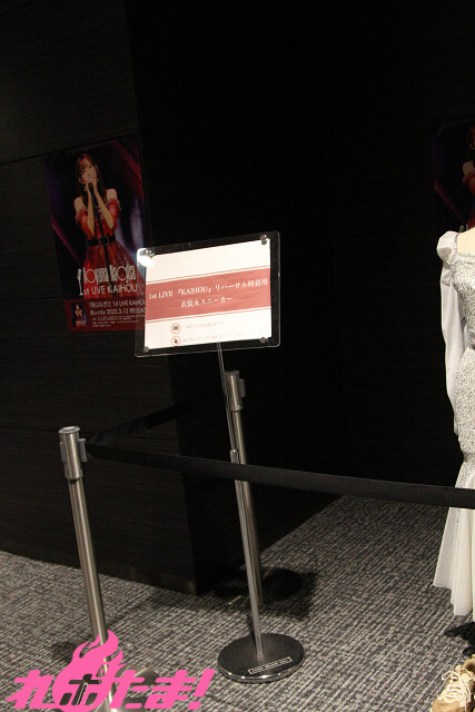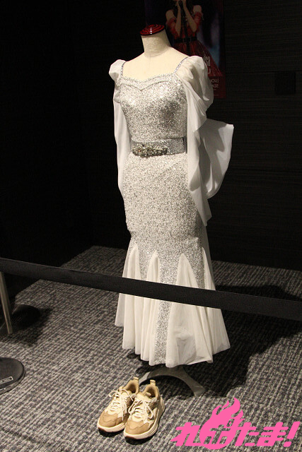 ▲イベント会場の入り口には、ライブのリハーサルで着用していた衣装とスニーカーの展示も。