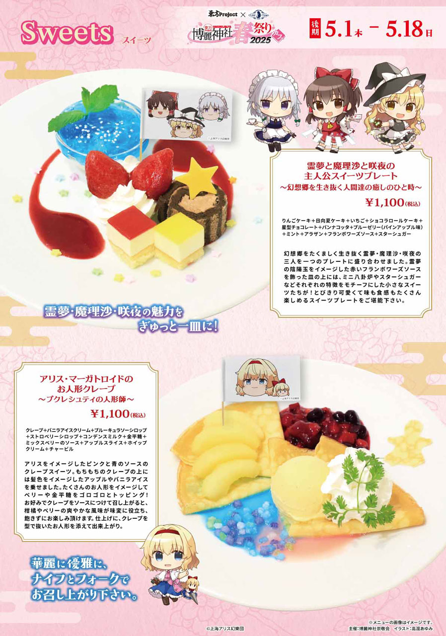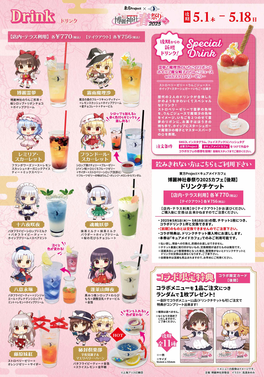 CURE MAID CAFÉ(キュアメイドカフェ)にて2025年4月12日(土)~5月18日(日)開催のコラボカフェ《東方Project×キュアメイドカフェ 博麗神社~春祭り2025カフェ》! 5月1日(木)からスタートした「後期」のコラボメニュー、特典情報が公開!