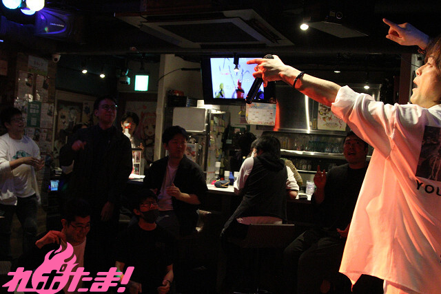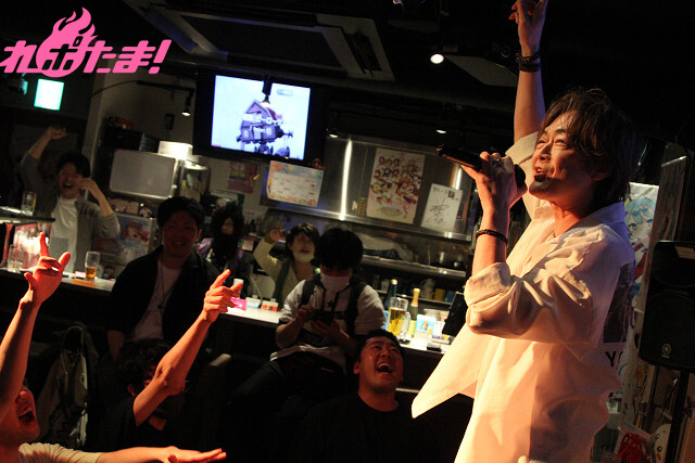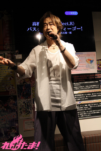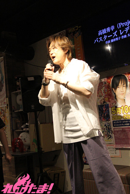 お店の入り口から高橋さんが登場すると、待ち構えたファンから一斉に拍手が沸き起こる。すでに“出来上がっていた”場内は、のっけからお祭り騒ぎ! まずは高橋さんの代表曲の1つである「バスターズ レディーゴー!」をあいさつ代わりに披露し、場内はさらなる盛り上がりをみせていた。