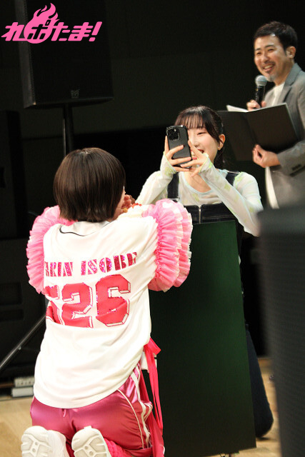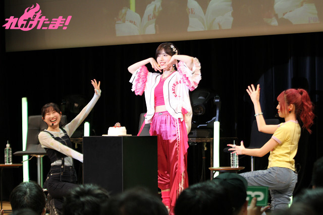 「第1部」は「楽しくにぎやかなステージ」というコンセプトで行われ、礒部さんいわく「おもしれー女たち」の涼本あきほさん、峯田茉優さんがゲストで登場! 2人はバースデーケーキを手に登場し、さっそく客席バックに記念撮影。さらに「花凜ちゃんの写真集は全部持っています!」と豪語する涼本さんは自らカメラマンを買って出て、礒部さんを楽しそうに激写。そんな姿を見た峯田さんは「涼本は誰彼構わずいくんですよね……」と苦笑いだった(笑)