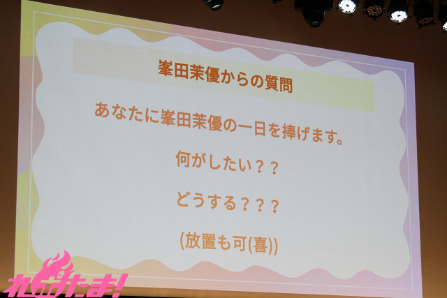 一方の峯田さんからは「あなたに峯田茉優の一日を捧げます。何がしたい?? どうする???(放置も可(喜))」という、重めの質問を浴びせられ(笑)、「プライベートのファッションセンスが素晴らしいので、一緒に買い物に行って“だまゆ(峯田さん)”色に染めてもらいたいです!」と、こちらもニコニコしながら回答していた。