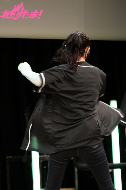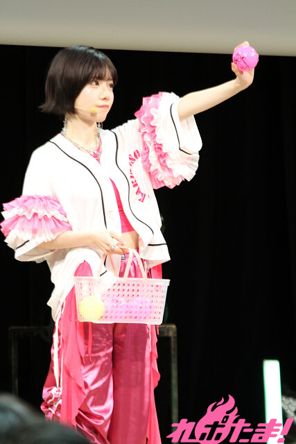 ここからは豪華賞品をかけ、礒部さんとゲストによる対決コーナー「熱闘! ぽかおた甲子園~三本勝負編~」が開幕! タイトル通り、3つのゲームで勝負を決していく、という企画となり、イベント開演時からピンク色のユニフォーム姿でキメていた礒部さんに加え、涼本さんと峯田さんも黒いユニフォームをまとい、気合十分!