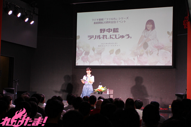 その後『野中藍 ラリルれ、サタデーナイト。』、『野中藍 ラリルれ、エブリバディ。』(YouTube番組)と形態を変え、25年にめでたく放送開始20周年を迎えた本番組のアニバーサリーイベントが6月8日(日)、東京カルチャーカルチャーで開催された。