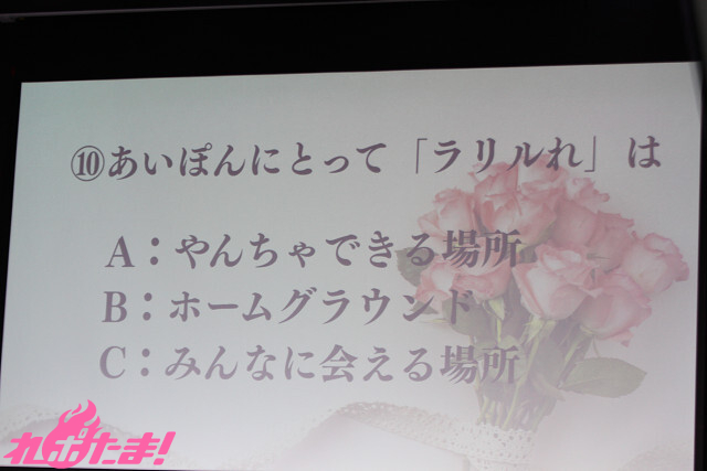 事前にあいぽんに関する3択問題が10問用意され、正解数が多かった人が「ラリルれ王」となり、記念のメダルを授与される、という注目の企画だ。