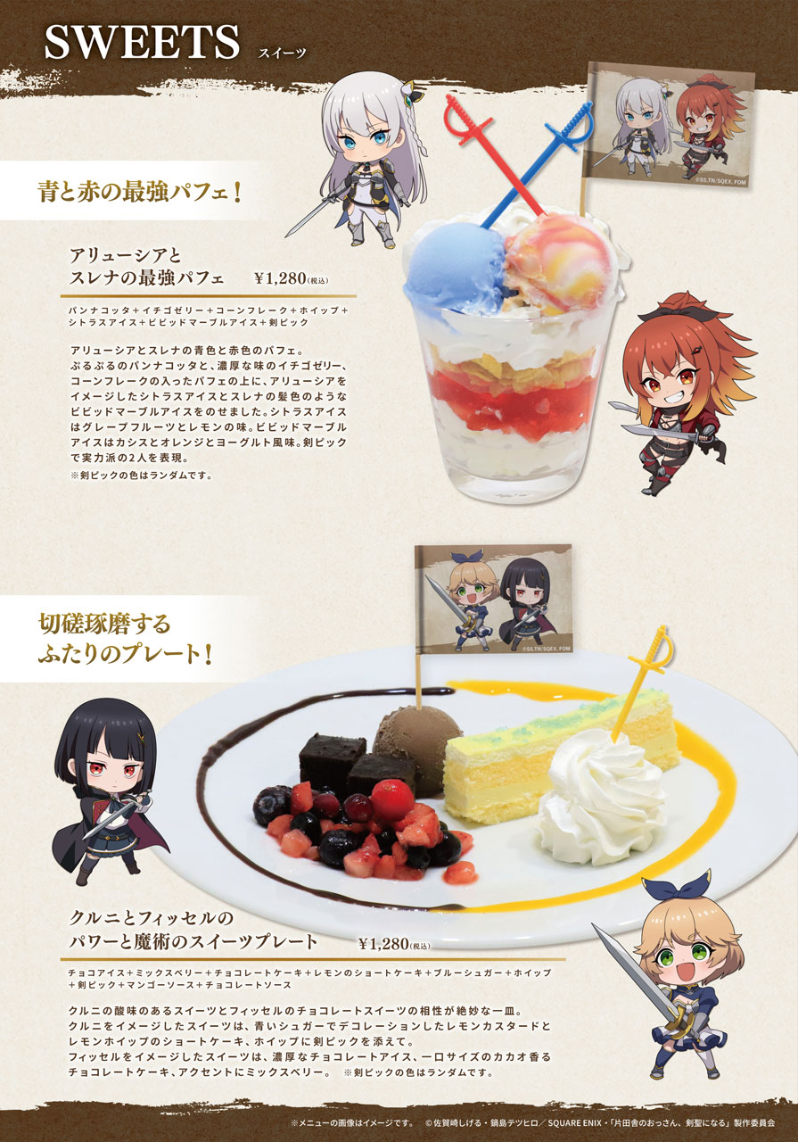「剣聖カレー」や、ベリルの楽しい酒場のひとときを表現した「「おっさん、腸詰を食う」プレート」をはじめ、「アリューシアとスレナの最強パフェ」「クルニとフィッセルのパワーと魔術のスイーツプレート」など、ベリルやアリューシアたちをイメージしたコラボメニューがラインナップ。