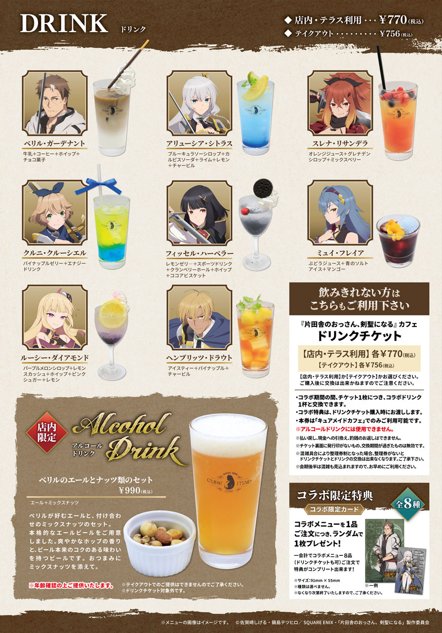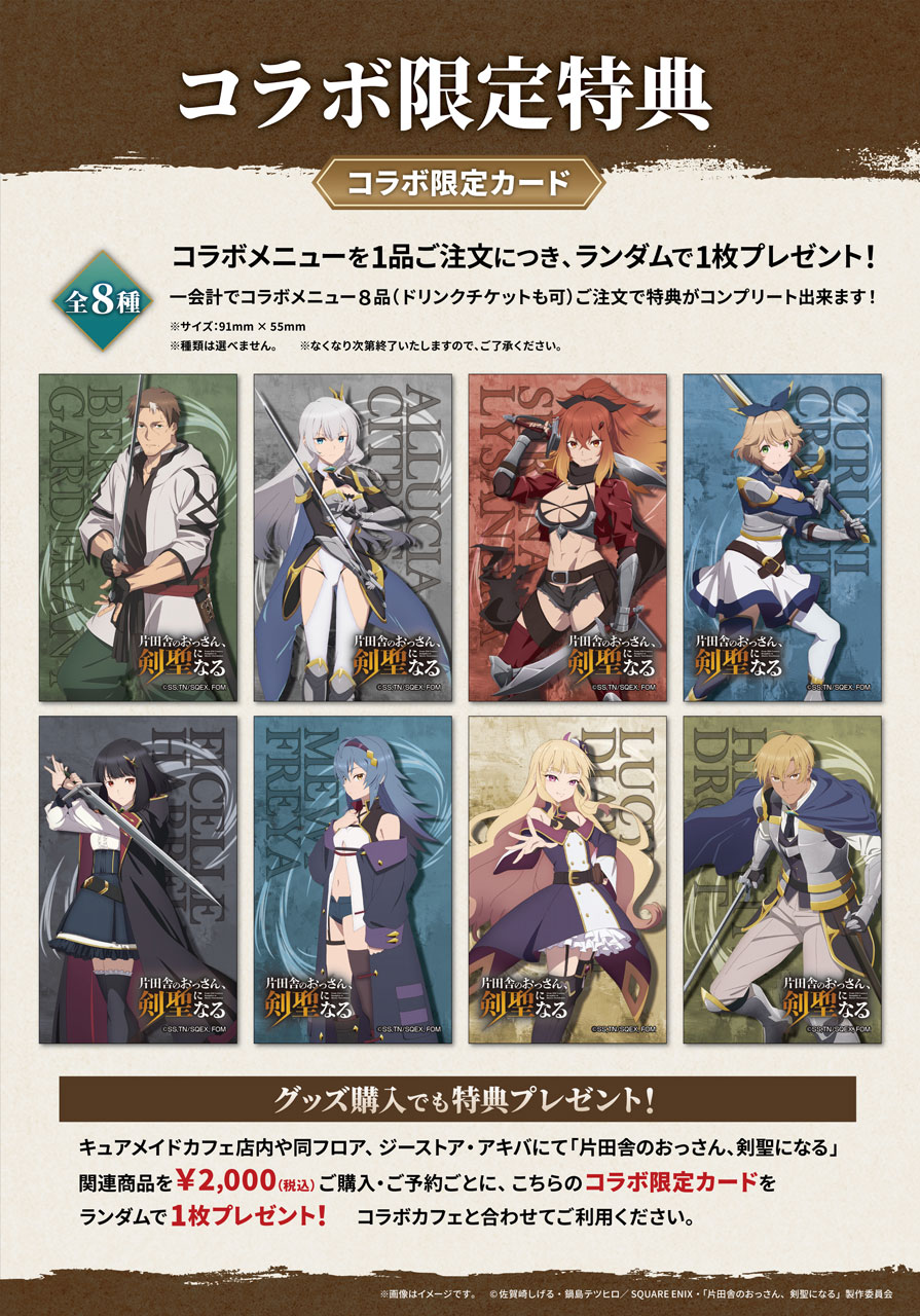 「CURE MAID CAFÉ(キュアメイドカフェ)」店内や同フロア、ジーストア・アキバ、にて『片田舎のおっさん、剣聖になる』関連商品を2,000円(税込)ご購入・ご予約ごとに、カフェで配布している【コラボ限定カード】をランダムで1枚お渡しします。