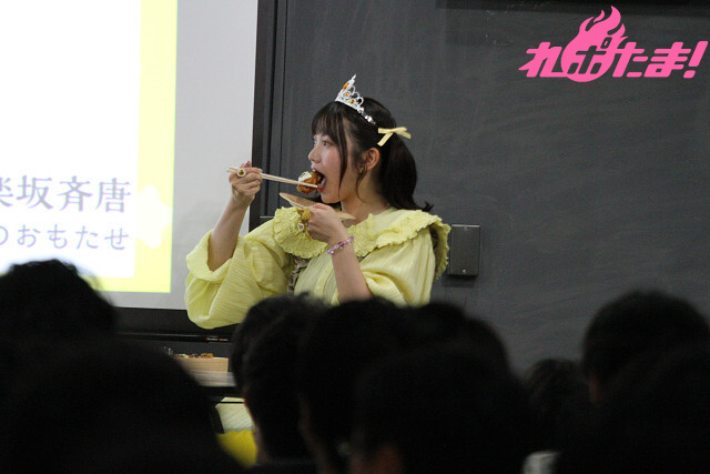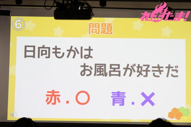 最初のコーナーは「からあげビンゴ」。5×5の巨大ビンゴカードがホワイトボードに張られ、ビンゴゲームに挑戦! 日向さんが考えた「日向もかはお風呂が好きだ。『〇』か『×』か?」、「日向もかはカレーライスを綺麗に食べられる。『〇』か『×』か?」など、次々に出題される2択問題にファンが回答。正解するとマスが埋まっていき、1ライン揃うごとに3つのからあげが食べられるというルールだ。