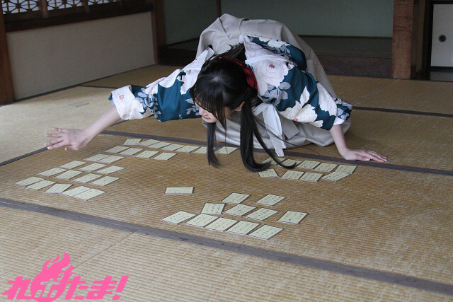 ▲某・人気競技かるた作品を参考に、ダイナミックな動きを見せる相良さん。