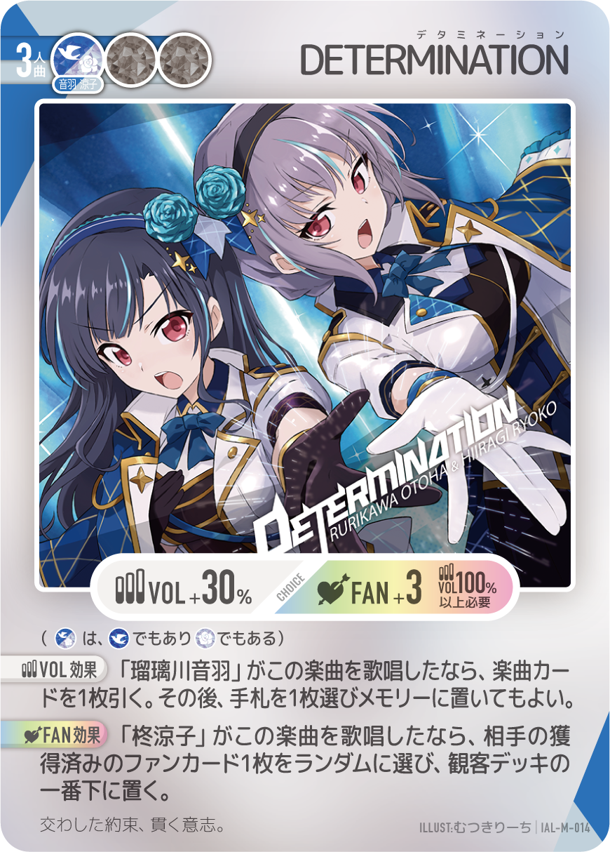 親の反対を押し切ってアイドルの夢を追いかける瑠璃川音羽と、それを支える柊 涼子。2人の関係性を描く楽曲として曲名を考えました。夢を決して諦めない、不退転の決意を「DETERMINATION」という言葉に込めています。
