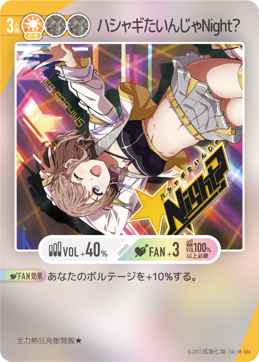 いつでも元気な篠田紗季らしい楽曲になるように曲名を考えました。アイドルアライブのゲーム上では、ライブ会場を盛り上げる能力に秀でたカードになる予定だったため、曲名からそのイメージが伝わるように意識しました。