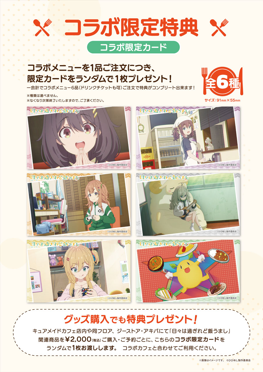 「CURE MAID CAFÉ(キュアメイドカフェ)」店内や同フロア、ジーストア・アキバにて「日々は過ぎれど飯うまし」関連商品を2,000円(税込)ご購入・ご予約ごとに、カフェで配布している【コラボ限定カード】をランダムで1枚お渡しします。