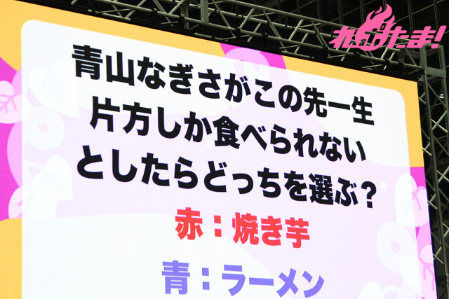 最後は「味覚を当てろ 青山なぎさ王決定戦」。「青山なぎさは自分の魅力をなんだと思っている?」(A.面白さ)、「青山なぎさはカラオケで十八番の曲はいつ歌う?」(A.最初に歌う)など、青山さんにまつわる問題が次々に出題。最後まで残ったポテ友には、さつまいもの成分が書かれたTシャツに青山さんのサインと落書きが入ったものがプレゼントされる……というルールとなっている。