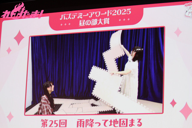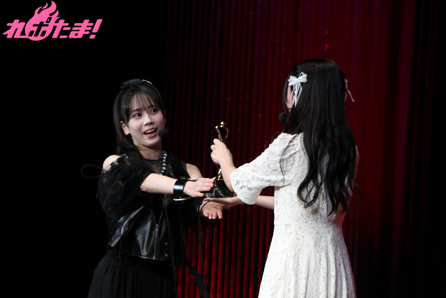 アツい企画のあとは、いよいよ「大賞」の発表。先ほど行った「雨降って壁固まる」チャレンジの元となった「雨降って地固まる」の回が選ばれ、鈴原さんにトロフィーを授与してもらい、笑顔の野中さんだった。
