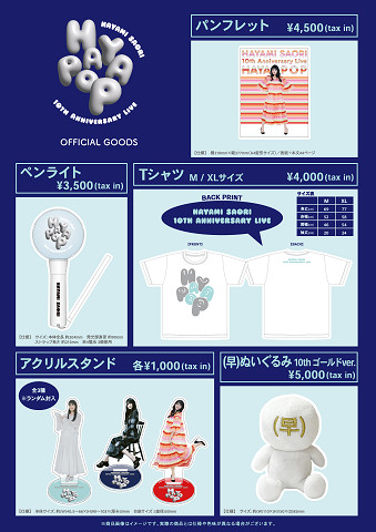 「HAYAMI SAORI 10th Anniversary Live “HAYAPOP”」会場販売のオリジナルグッズ一覧。