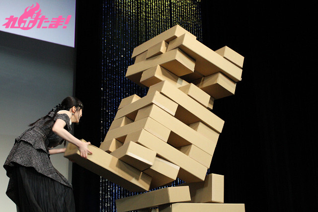 両者は一歩も譲らず、結那さんのターンでいよいよ動かせるブロックがなくなってしまう……。上部を支える一本のブロックを「テーブルクロス引き」のような形で一気に引き抜く、という賭けに出たものの、あえなく失敗……。華々しく散ったのだった(笑)