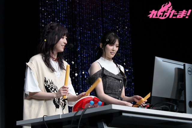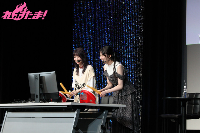 最後は2人が対戦ゲームで対決する「げーみんぐにゃいと」。まずは太鼓型のコントローラーを使用する人気のリズムゲーム『太鼓の達人 ドンダフルフェスティバル』。「ちゅ、多様性。」や「お願いマッスル」など、アニメファンにはおなじみの楽曲で対決! バチで力いっぱい叩いた効果もあり(?)結那さんが総合勝利を収めた。
