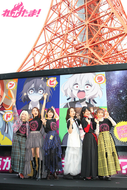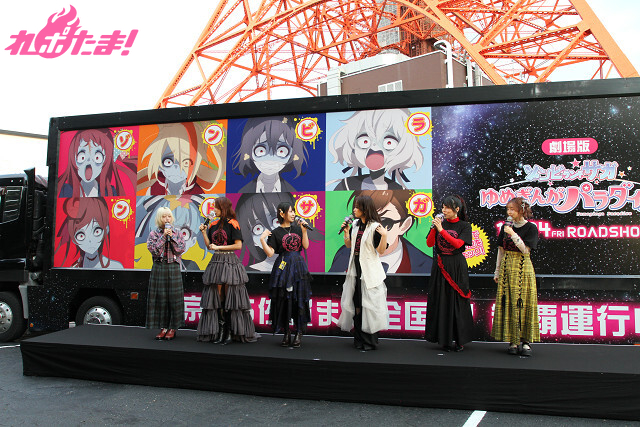 当日は作中に登場するアイドルグループ「フランシュシュ」のメンバー、源 さくら役・本渡 楓、⼆階堂 サキ役・⽥野アサミ、⽔野 愛役・種⽥梨沙、紺野純⼦役・河瀬茉希、ゆうぎり役・⾐川⾥佳、星川リリィ役・⽥中美海が登壇。東京タワーとトラックをバックにトークを展開した。