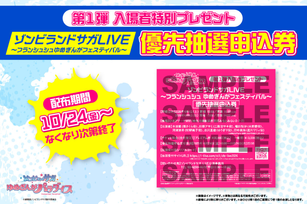 なお、「第1弾 入場者特別プレゼント」として、劇場に足を運んだ人に向け、ライブの「優先抽選申込券」が“先着限定”で配られるとのことなので、こちらも要注目だ。