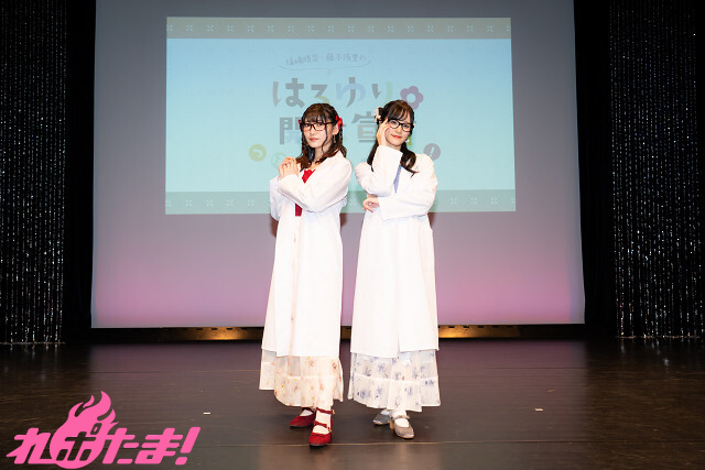 ここで2人は一時退場し、「藤本侑里の漫画セラピー」をイメージした白衣に着替えてふたたびステージに登場! はっぱさんたちからの「回って~!」の声に応え、その場でかわいらしくクルクルと回り、アピール。