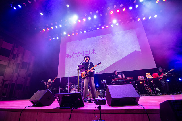 「リレイ」では、重厚なベースとドラムに、伊根のギターが繊細に重なり合い、感情の奥底をそっと掘り下げるようなメッセージが、じわじわと観客の胸に染み渡っていった。ステージ後方のスクリーンには映像も投影され、視覚と聴覚の両面から、彼の世界観が丁寧に紡がれていく。