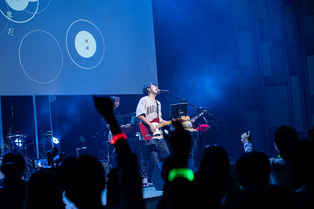 イベントのトリを飾ったのは、みきとP。ギターを手にステージへと現れると、爽やかで切れ味鋭いサウンドと共に「Who are」でライブがスタート。柔らかくも芯のある歌声に、観客は一気に引き込まれていく。サビでは、ペンライトや手を振りながらステージに熱いレスポンスが送られ、熱量が一気に上昇していく。
