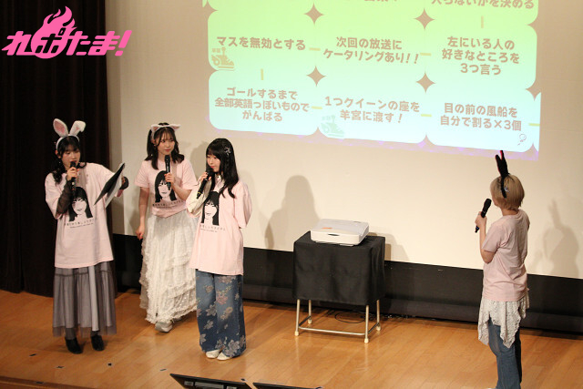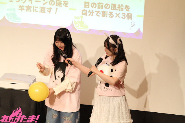 「風船を3つ割る」というミッションには、羊宮さんと水野さんが躊躇なく風船を割り、場内を驚かせたり、村上さんが「昼の部」に続いてダンベルを持ち上げたり、同じく村上さんが「伊駒さんのいいところ」を3つ挙げたり、途中で羊宮さんがカチューシャをつけることになったり……。常に笑いが絶えない、バラエティに富んだミッションで客席を楽しませていた。