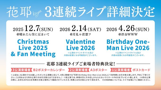12月7日(日)に東京の代官山「晴れたら空に豆まいて」にて「花耶 Christmas Live 2025 & Fan Meeting」(2部制)の開催が決定しています。
