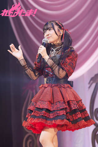 赤と黒のドレスに身を包み、胸元にはシルバーのリボンといういで立ちで登場した鈴原さん。昼の部は「魔法少女風」の衣装だったそうだが、夜の部を迎える前に闇落ちしてしまった(という設定)だそう。普段あまり見る機会のないファッションに、会場からはよろこびの歓声が上がっていた。