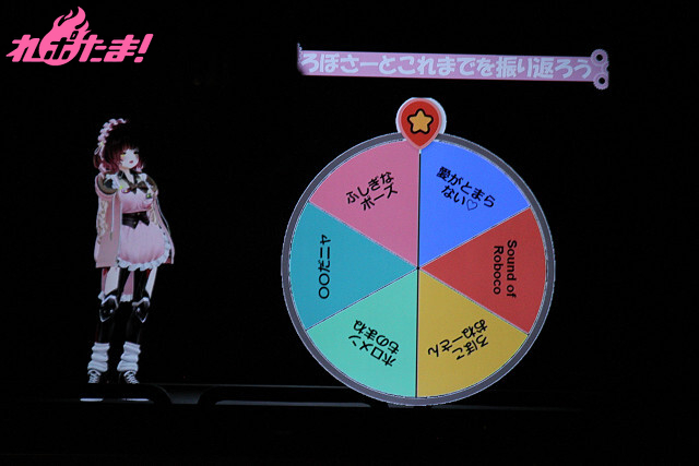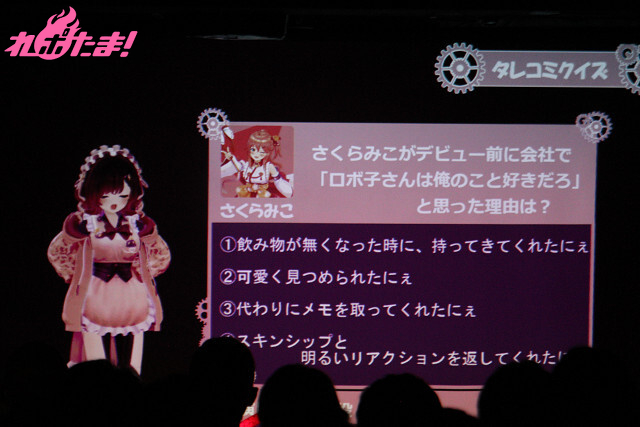 さくらみこからのリクエストは「ヤンデレメイド風」。客席に向けて、ヤンデレメイドを演じながら「どの答えが正解だと思う?」と問いかけるロボ子さん。オーディエンスの協力もあり、「さくらみこがデビュー前に会社で『ロボ子さんは俺のこと好きだろ』と思った理由は?」という問題に対し、見事に正解(A:スキンシップと明るいリアクションをかえしてくれたにぇ)を導き出していた。