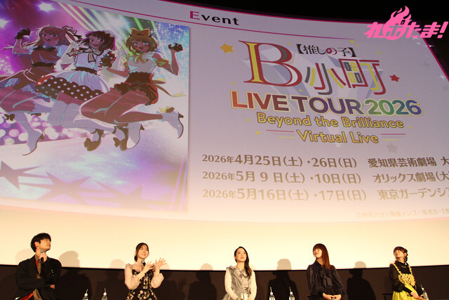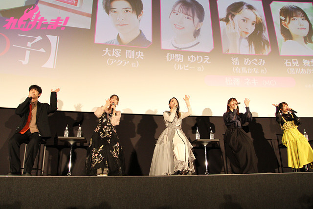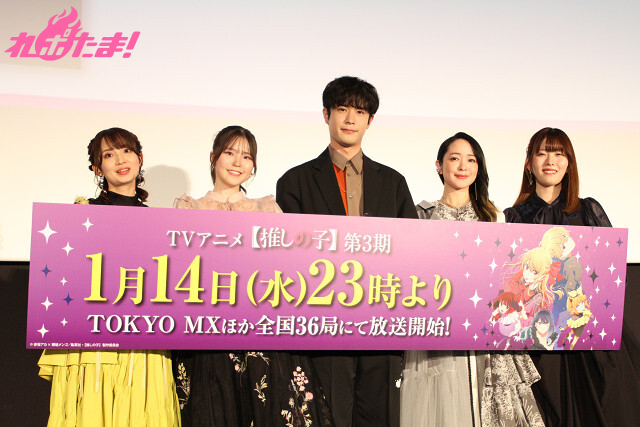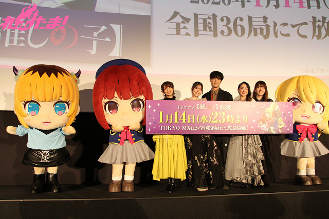 テレビアニメ『【推しの子】』の第3期が2026年1月14日より放送開始! 東京・丸の内ピカデリーにて25年12月28日(日)に開催された先行上映会では、上映後にアクア役・大塚剛央、ルビー役・伊駒ゆりえ、有馬かな役・潘 めぐみ、黒川あかね役・石見舞菜香、MEMちょ役・大久保瑠美が登壇したトークショーが行われた。