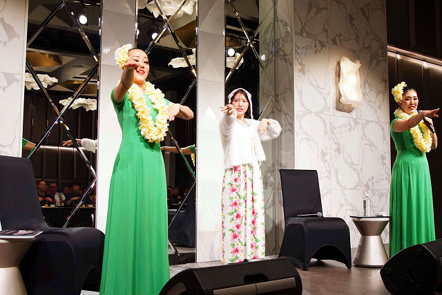 ここからは「夏織ちゃんのフラダンスチャレンジ企画」。マイレラウリイフラスタジオの岡野先生・川密先生が登場し、その場でデモンストレーションを行なった。