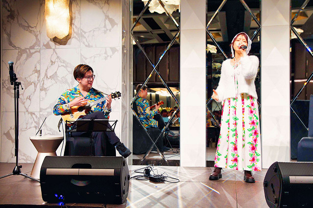 石原さんはウクレレの演奏をバックに歌うのは今回が初めてとのことで、この日を楽しみにしてきたそう。RIO氏の演奏をバックに、常夏の島にマッチした「SUMMER DROP」、「Paraglider」の2曲を披露。「ウクレレの音色でより南国感が出ます!」とうれしそうに話していた。