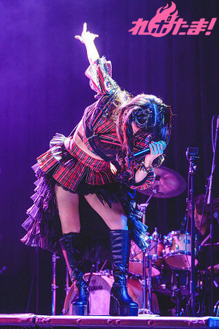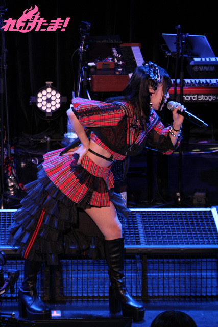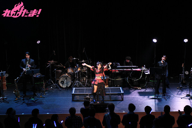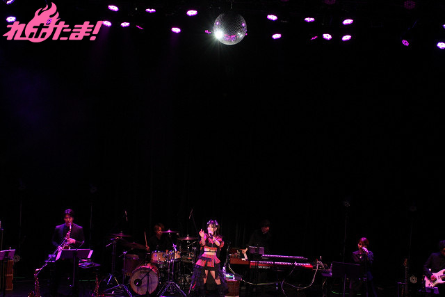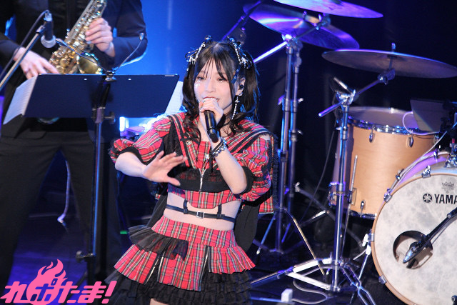 5人分のパワーを込めてワルキューレの「いけないボーダーライン」、ハンドワイパーを見せながら、ステージを歩きつつ笑顔で「ブルーウォーター」を歌唱すると、赤い光に照らされながらパワフルな歌声で「甲賀忍法帖」を披露。最後は拳をにぎりしめ、フィニッシュした。