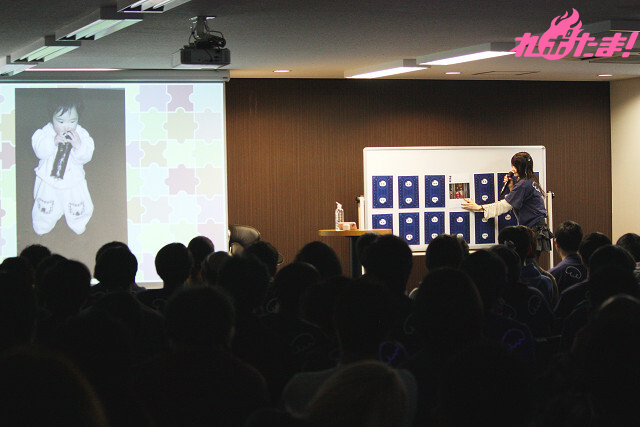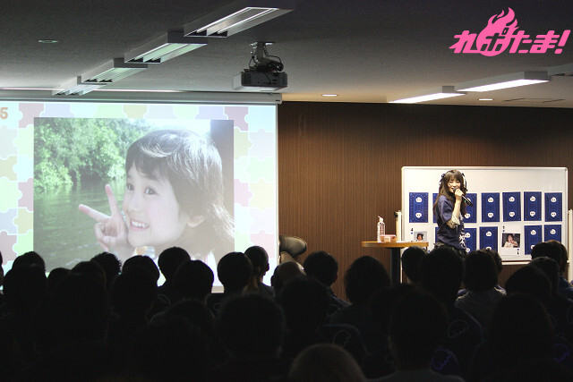 それぞれの写真に対し、エピソード付きで紹介していく橘さん。ある時期から一重だったまぶたが急に二重になった話や、家族と一緒に行った旅行の話など、そのどれもが興味深いものばかり。食いしん坊だったという幼児時代や姉との仲よしツーショット、旅行先でのピースサインなど、プライベート感満載の写真の数々にファンの目は釘付けだった。