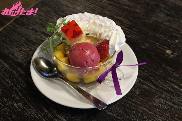 [ローズシロップ+紅茶ゼリー+紫ゼリー+ラベンダーシロップ+マンゴー+ベリーソルベ+セサミビスケット+イチゴケーキ+イチゴ+ホイップ+ジュエリーシュガーパープル+チャービル]