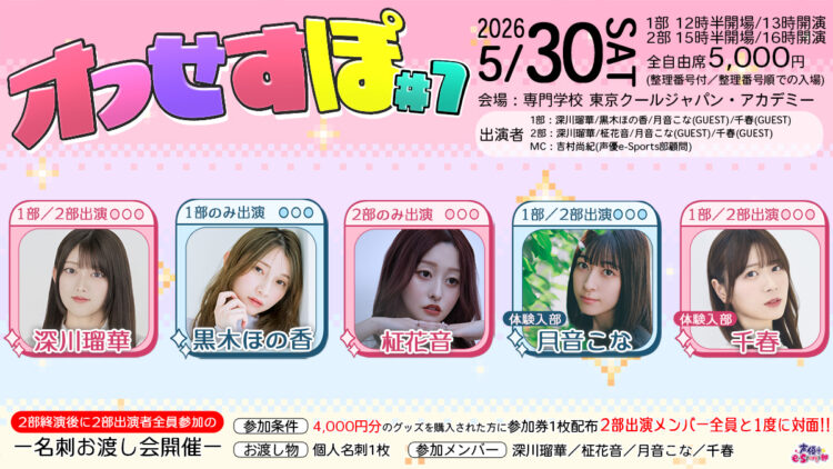 総勢44名のガチゲーマー声優たちによるゲーム・eスポーツシーンを応援するプロジェクト「声優e-Sports部」のオフラインイベント「オフせすぽ」の第7弾が、2026年5月30日(土)、東京「専門学校東京クールジャパン・アカデミー」にて開催決定!