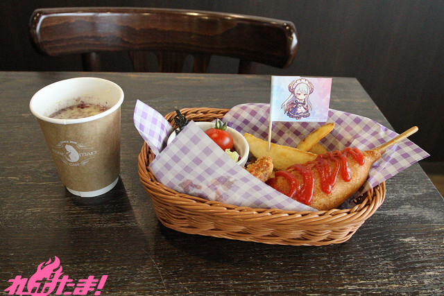 [アメリカンドック+ケチャップ+ポテト+唐揚げ+サラダ+ミニトマト+黒トルティーヤ+コーンクリームスープ+紫芋パウダー+パセリ]